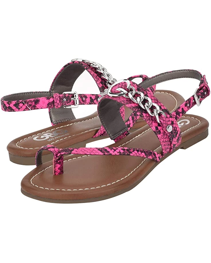 - The GBG Los Angeles Lonsyn sandal features a brand logo hardware across instep in a faux-leather upper.