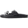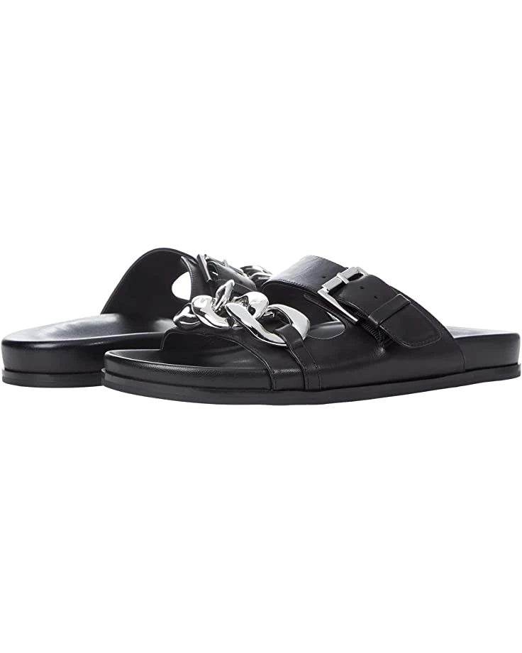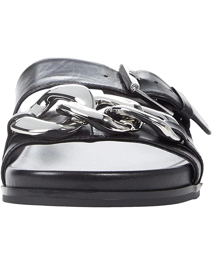 - Pebbled leather upper with metal chain embellishment over an open, round toe.