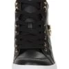 - Lace-up sneaker with padded collar, hidden wedge, and rounded toe.